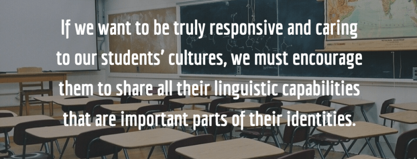At the end of the day, I can’t go back and fix the mistakes I made as a 21-year-old teacher. I can grow my understanding of my role as an educator: I don’t just prepare students but should also show them how powerful they are. If we want to be truly responsive and caring to our students’ cultures, we must encourage them to share all their linguistic capabilities that are important parts of their identities. In doing so, we can provide new ways for them to communicate with an audience and demonstrate that their identities are not only seen but valued as well.